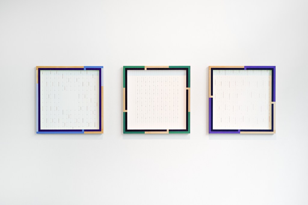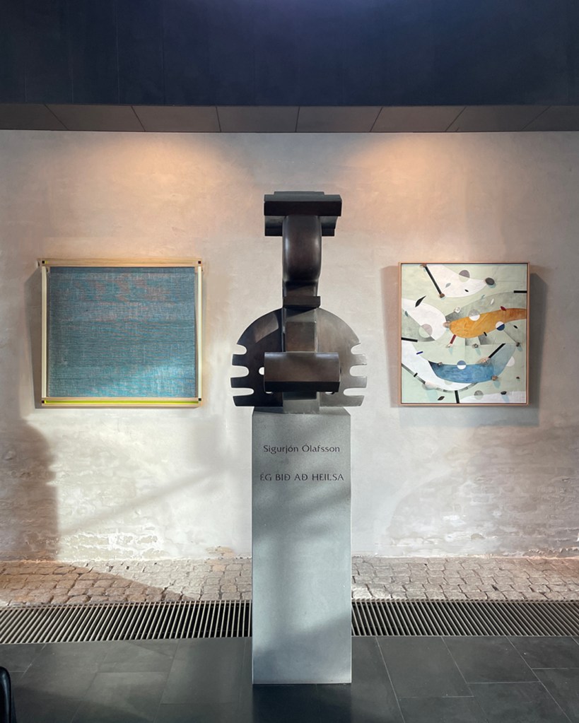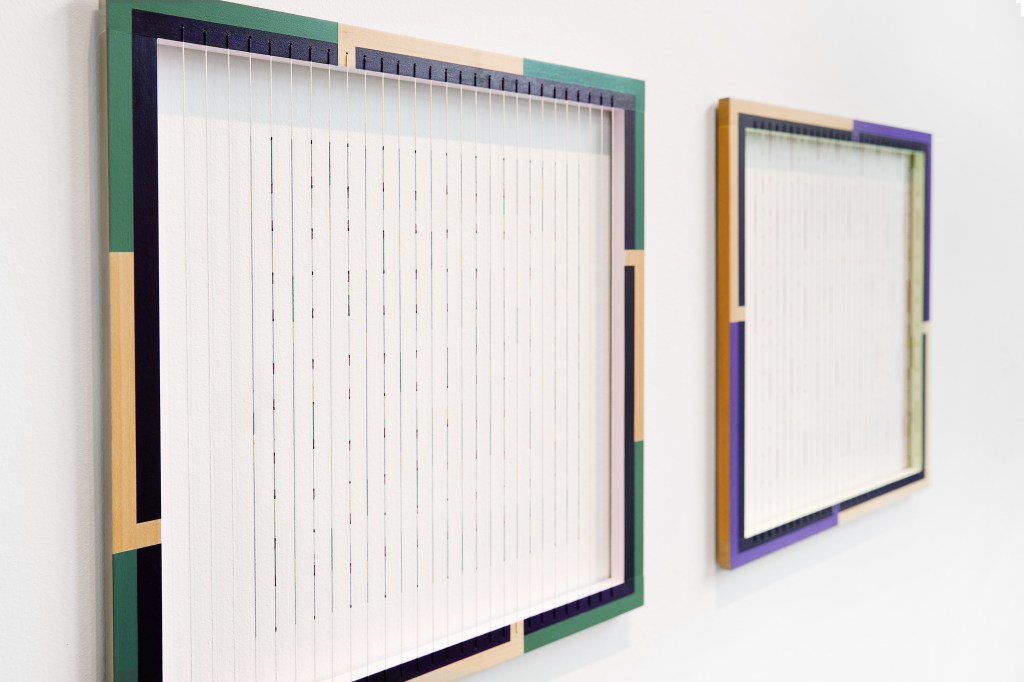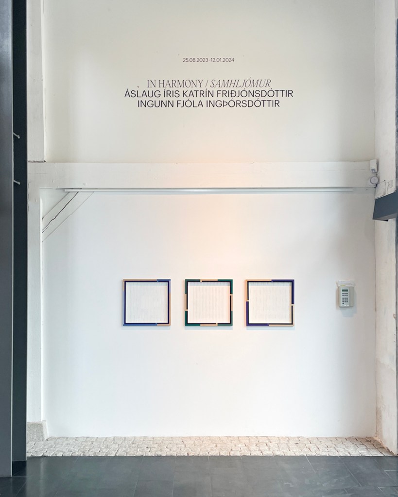 The exhibition In harmony presents works by Icelandic artists Ingunn Fjóla Ingþórsdóttir and Áslaug Íris Katrín Friðjónsdóttir. The two artists approach the medium of painting from a sculptural and conceptual outlook, interested in the delimitations around painting and its boundaries. The works provide sensory experiences of pigments and textural materials such as textile and stone. While Ingunn Fjóla reflects on systems, patterns and colors with an interplay between weaving and painting, Áslaug Íris works with a language of abstraction, repetition, and manipulation. Negative space, relativity, abstract forms, and the harmony between composition, colors and materials provide interesting points of intersection between their two distinct practices.
