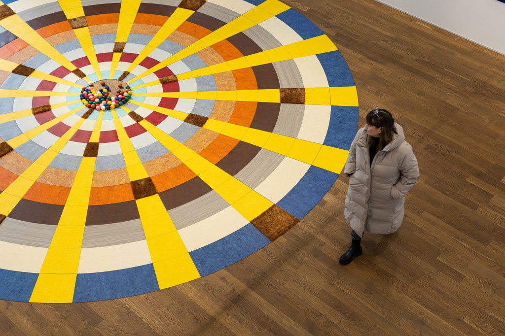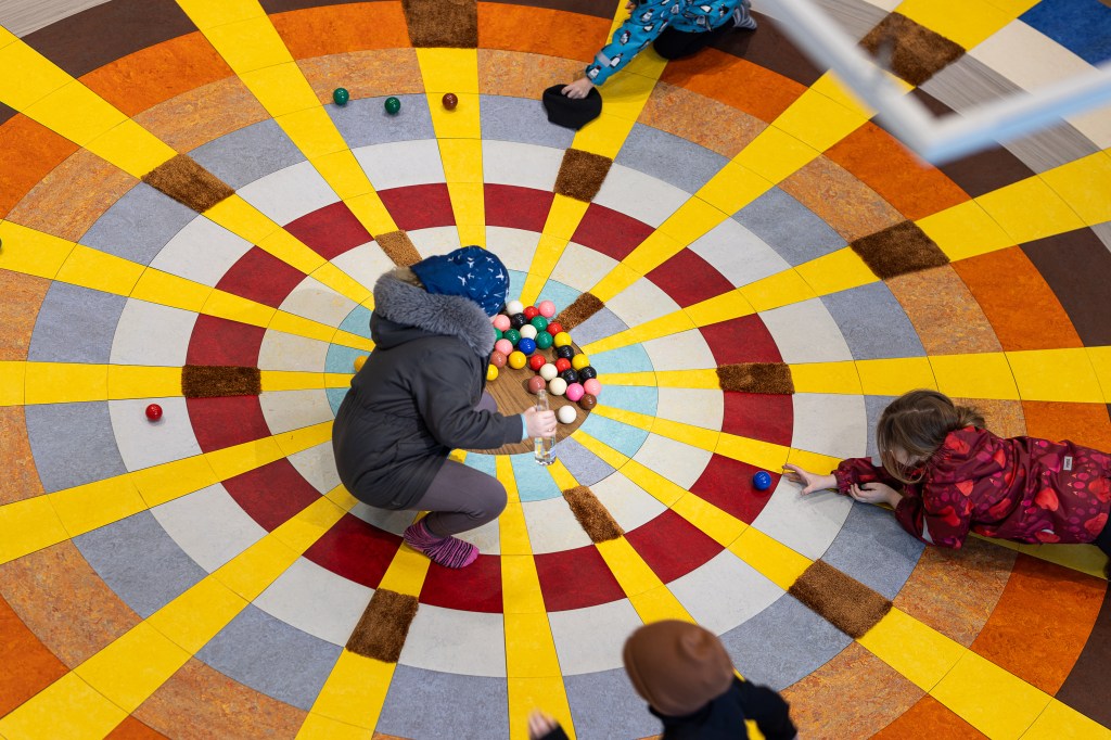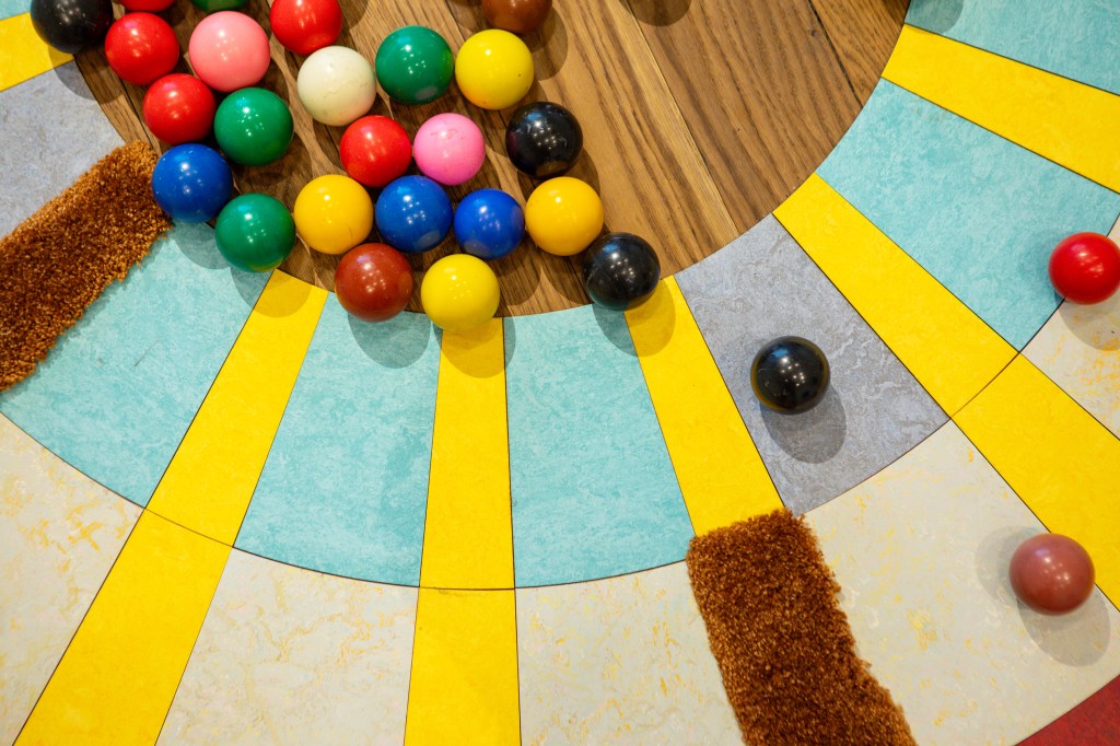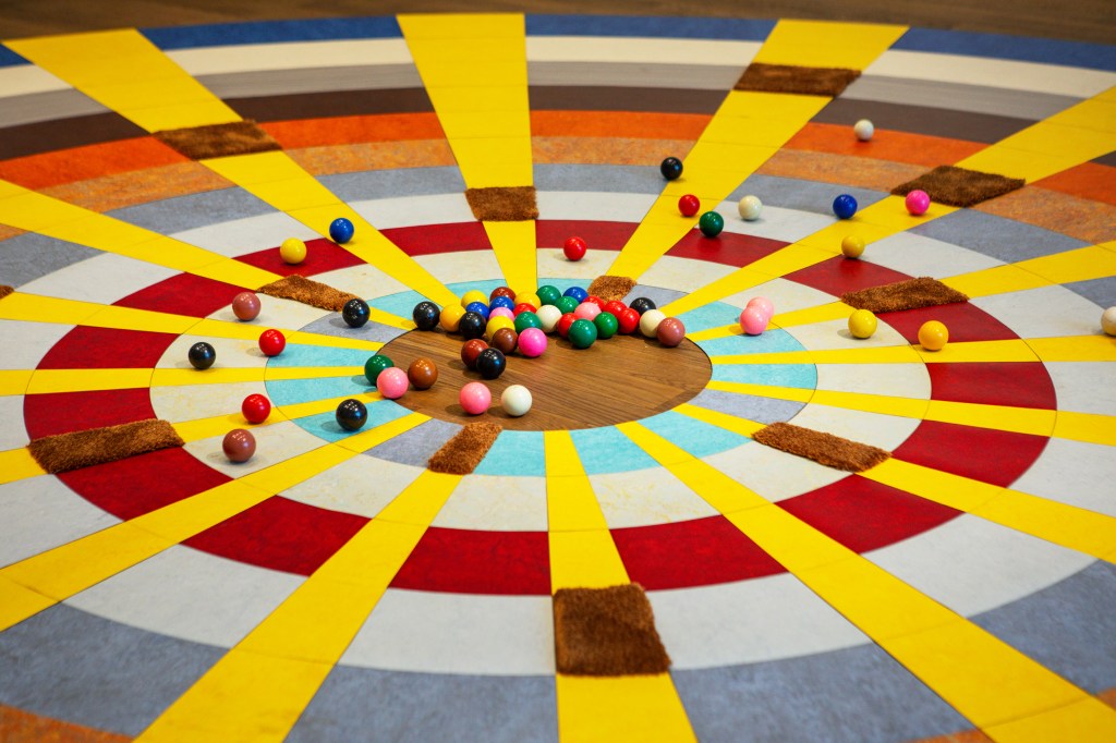 The title Primum Mobile refers to a medieval world view, when earth was considered to be in the middle of the universe and orbiting around her were various spheres of chemical elements, planets, sun and moon. The outer most sphere was called Primum Mobile or primary motor hemisphere which was a kind of divine force that powered the movements of all the other spheres. The work is inspired by this ancient world view, based on the geocentric model, but within it is also a reference to another old world view, the heliocentric model, both which are incorrect, according to modern science. The balls in the inner most core of the circle, which will spread, with the help of guests, could remind us of the dominant idea about the Big Bang, how the world began in one dot and has been expanding ever since. The work also makes us think of the technological and ideological systems that control imperceptibly both humans and the whole world. The work poses questions on how world views and ruling ideological systems are formed, who governs and what authority and influence does the individual really have within those systems