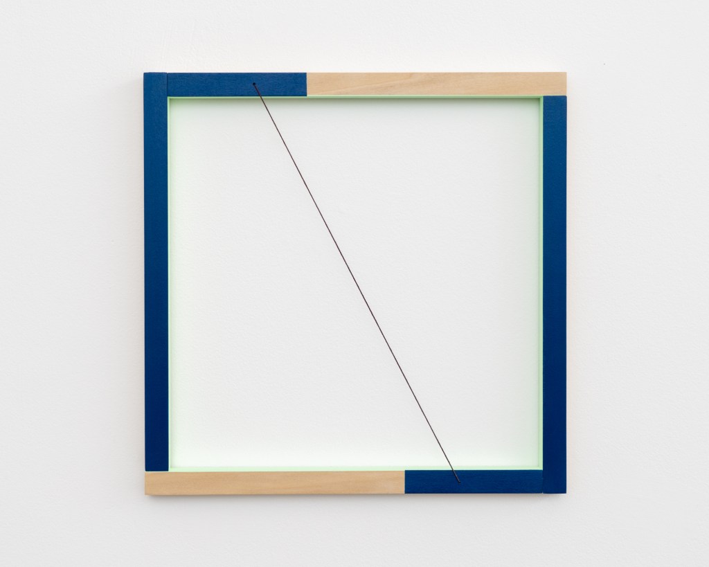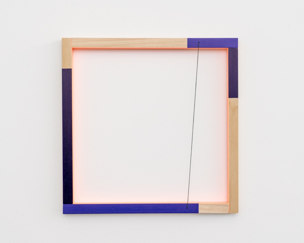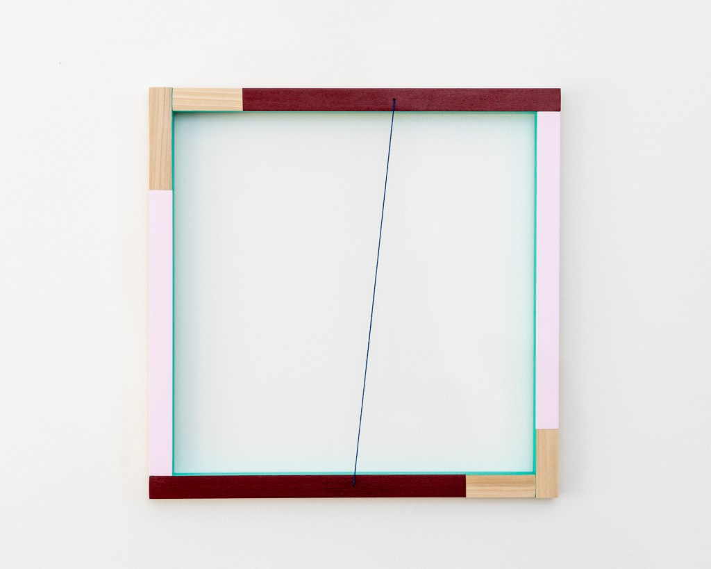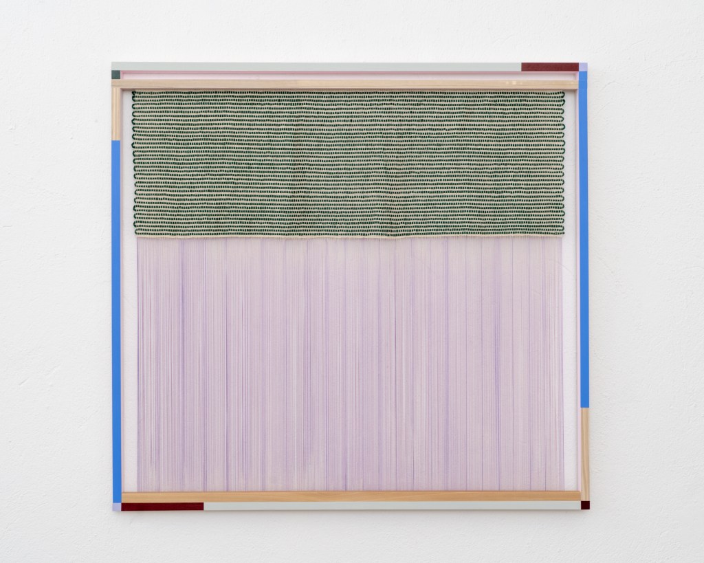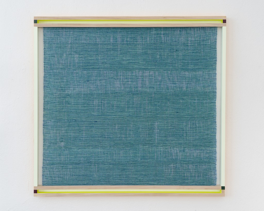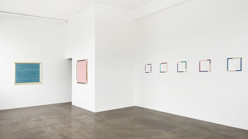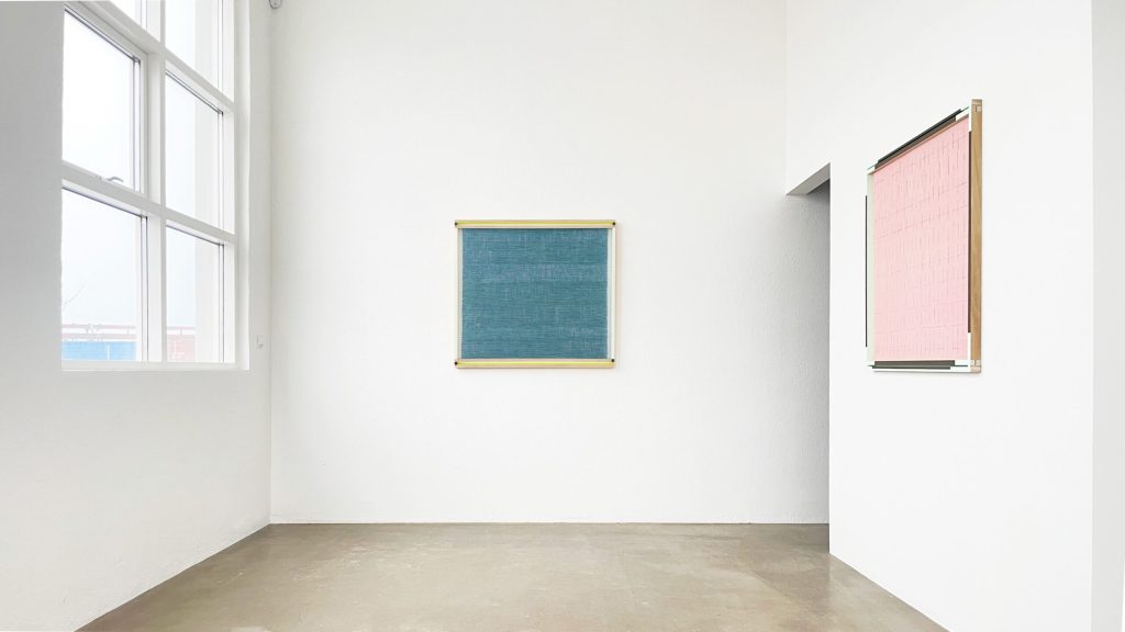 Colors appear in different ways in the works and influence each other. Pigments are either woven into the material or painted upon surfaces on the side and edges of the frame. Swathes of color are projected from the frame onto the wall behind and register in different ways depending on the lighting conditions and interaction with other colors. The works in the exhibition evoke an individual and unique sensory experience for the viewer.