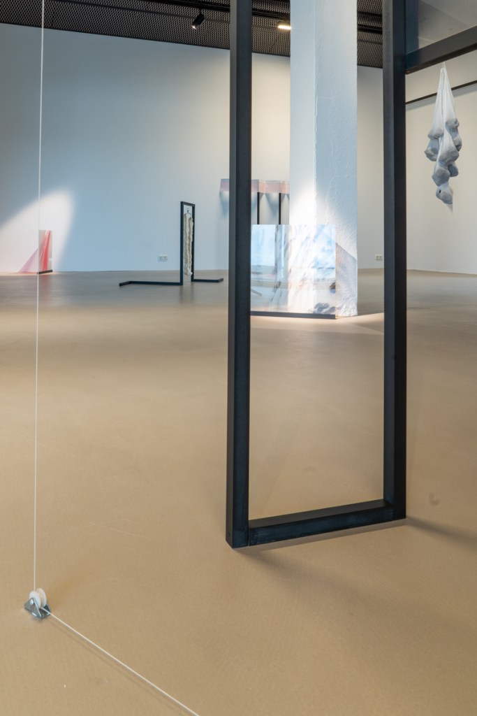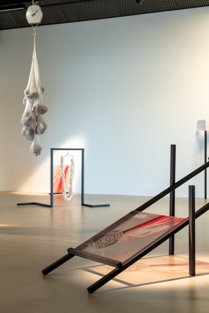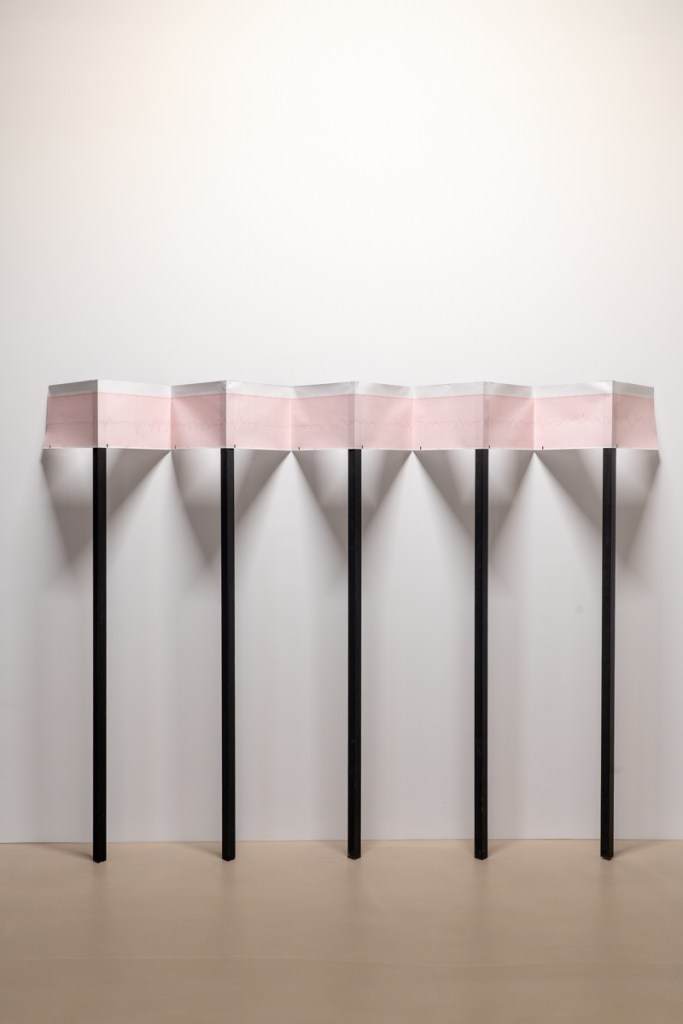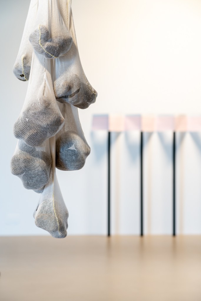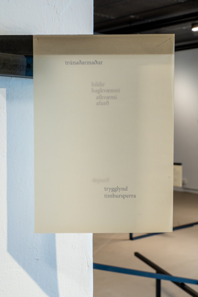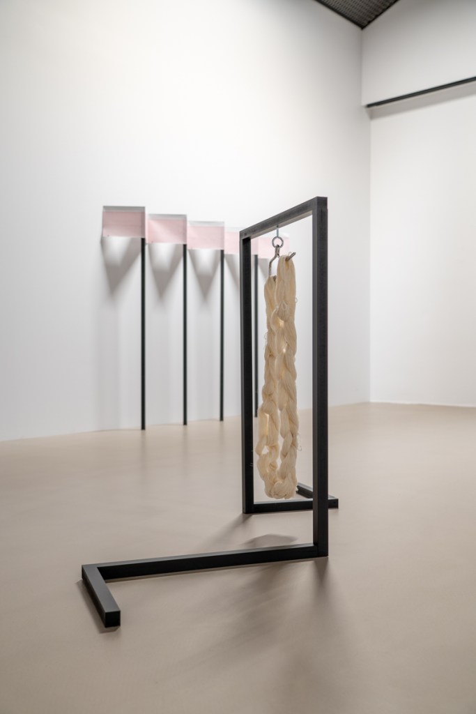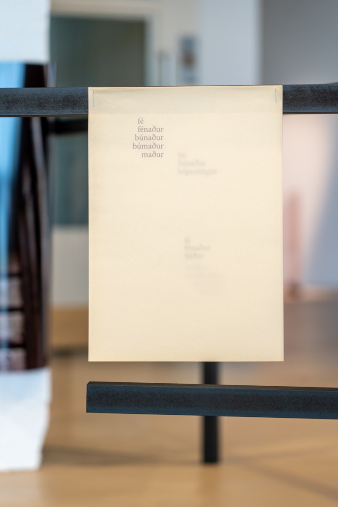 The works of Ingunn Fjóla Ingþórsdóttir are based on methods, vocabulary and systems surrounding sheep farming. The work Obituaries is a series of textworks, displaying words from interviews with former employees in the slaughterhouse. Fyrirrista, liðléttingar, fláningsmaður, rotklefi, strjúpi (gutting knife, flayer, knock[1]out room, headless neck) – fragments from the slaughtering world are printed on architectural paper, layered to make parts of the text less visible. Some of the words, their meanings and connections are clear, some less so, like fragments of memory, hard to recall. The work shows us a reflection of the past and the activity that used to take place here. The work Flow also shows the time, in the form of the perpetual movement that characterised the process. It consists of painted cotton threads, in constant motor-driven motion, and echoes a processing belt that runs endlessly. The movement is accompanied by a steady droning which can be soothing or overwhelming – depending on how we perceive the work.