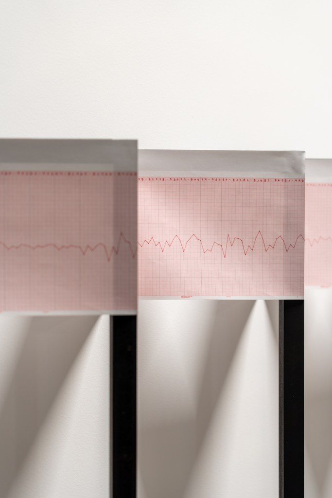 Verk Ingunnar Fjólu Ingþórsdóttur byggja á þeim aðferðum, orðfæri og kerfum sem umlykja sauðfjárrækt. Verkið Minningarorð er röð textaverka sem birta orð úr viðtölum við fyrrum starfsmenn Sláturhússins. Fyrirrista, liðléttingar, fláningsmaður, rotklefi, strjúpi – glefsur úr heimi slátrunar eru prentaðar á arkitektapappír sem lagður er í nokkrum lögum svo textinn verður missýnilegur. Orðin, merking þeirra og tengingar verða misljós líkt og minningabrot sem erfitt er að henda reiður á. Í verkinu sjáum við endurspeglun liðins tíma og þess vinnuflæðis sem átti sér stað í rýminu áður fyrr. Verkið Flæði birtir okkur einnig tímann í formi þeirrar sífelldu hreyfingar sem vinnslunni fylgir. Verkið samanstendur af máluðum bómullarþráðum sem hreyfast viðstöðulaust í mótorum og kallast á við vinnslulínu sem heldur áfram í endaleysu. Hreyfingunni fylgir stöðugur niður sem getur verið yfirþyrmandi eða róandi – allt eftir okkar aðkomu að verkinu.