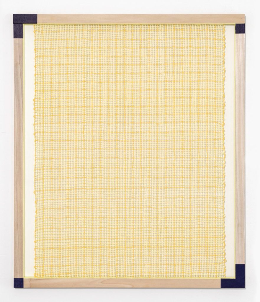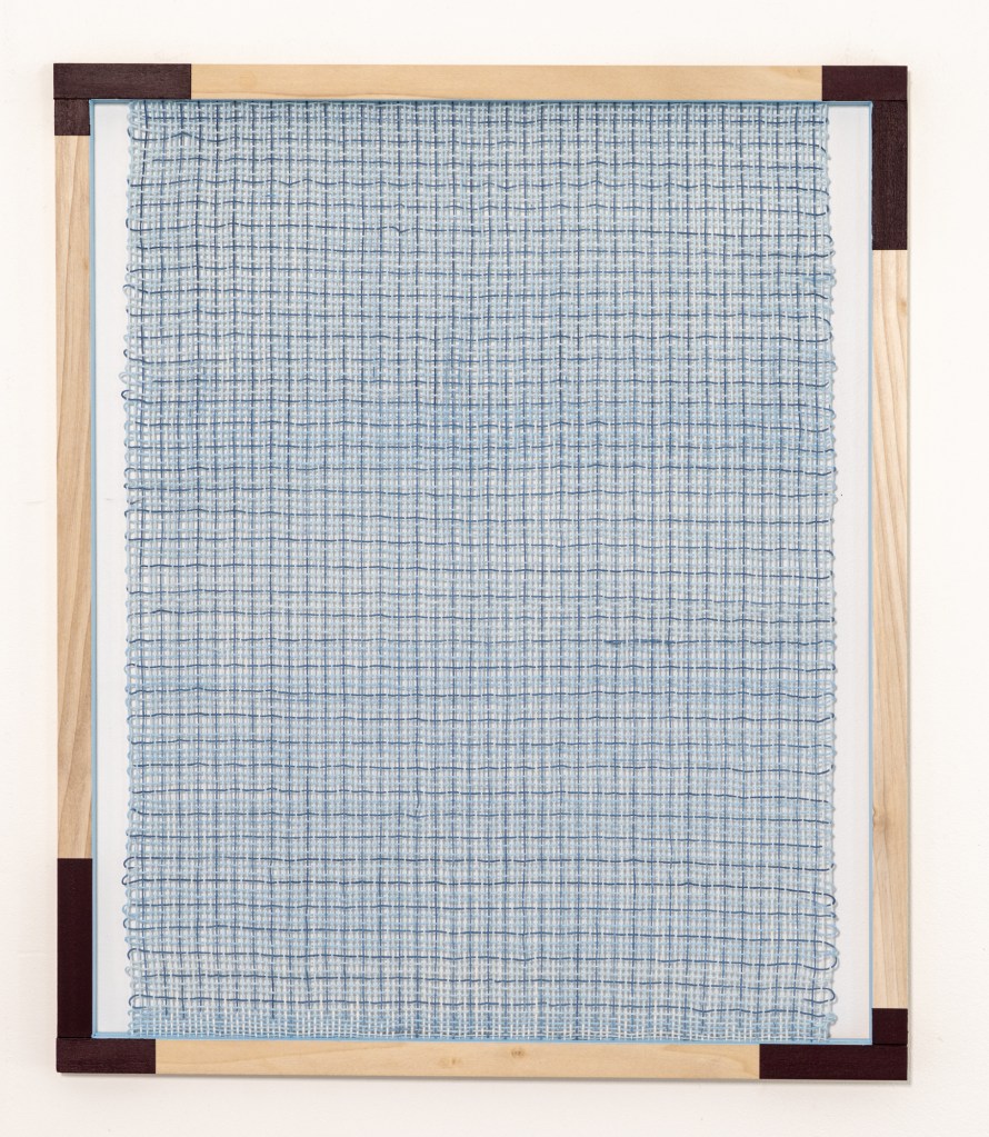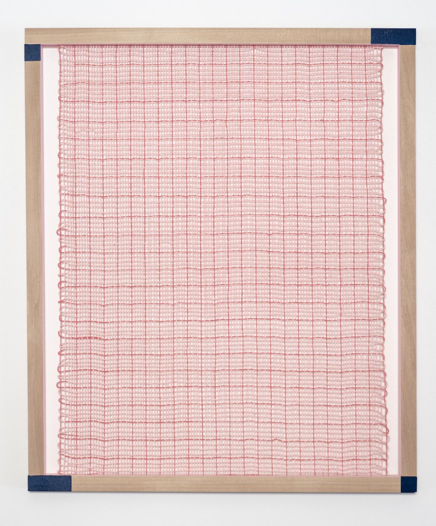 Woven grid (pale pink, dark pink, deep blue), 2024 Acrylics, cotton, wood 52 x 43,5 cmWoven Grid (pale turquoise, dark blue, deep burgundy), 2024 Acrylics, cotton, wood 52 x 43,5 cm Woven Grid (pale blue, dark blue, deep burgundy), 2024 Acrylics, cotton, wood 52 x 43,5 cmWoven grid (pale yellow, deep yellow, dark purple)